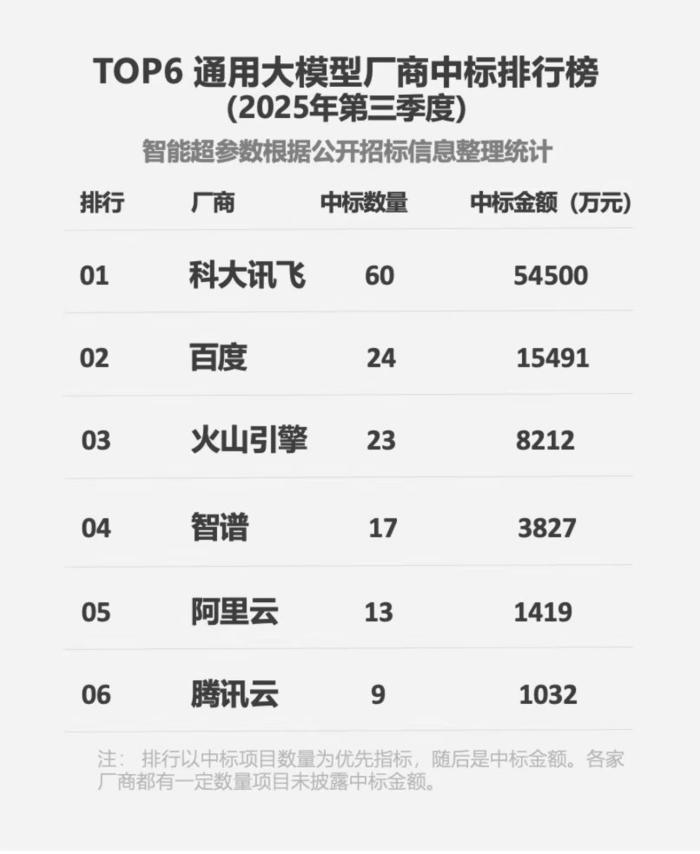 落地表现强化了科大讯飞“样本”的象征意义。在《2025年第三季度通用大模型厂商中标排行榜》中,科大讯飞以60个中标项目、5.45亿元中标金额稳居第一,连续5个季度成为大模型“标王”,在大模型商业化落地尤其是政府和央国企采购环节建立明显优势。